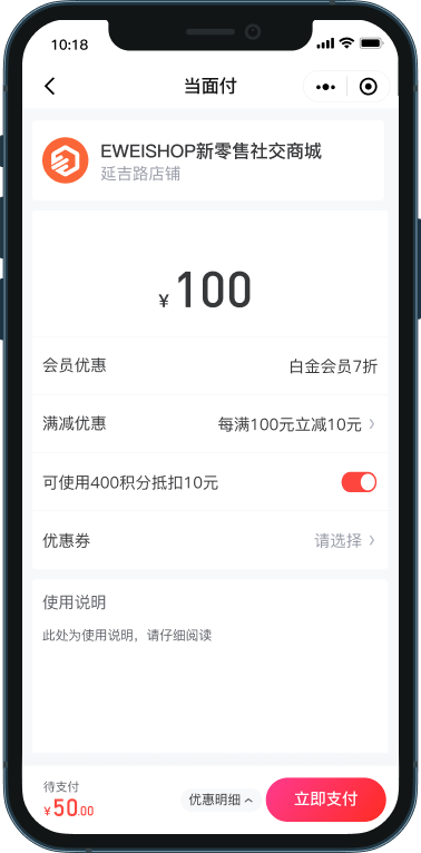 可将“当面付”功能通过商城装修添加在商城首页按钮处,醒目位置让顾客付款更便捷。