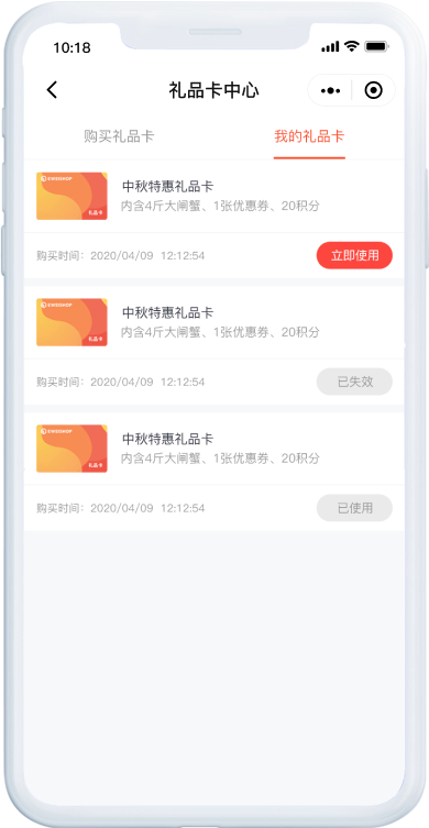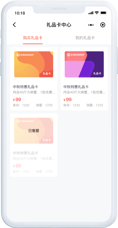 自定义卡面、库存、售价等信息;礼品卡关联兑换码,转赠方便,使用更人性化。
