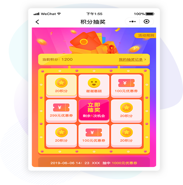 设置抽奖消耗积分,可抽取积分及优惠券,刺激用户多次消费。